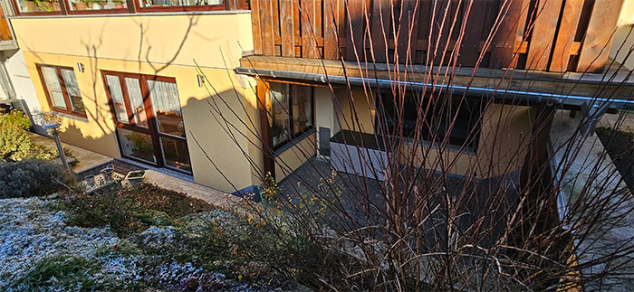 Das linke Fenster ist das Küchenfenster der Ferienwohnung. Die beiden rechten Fenster gehören wie die große Tür zum Gästezimmer.